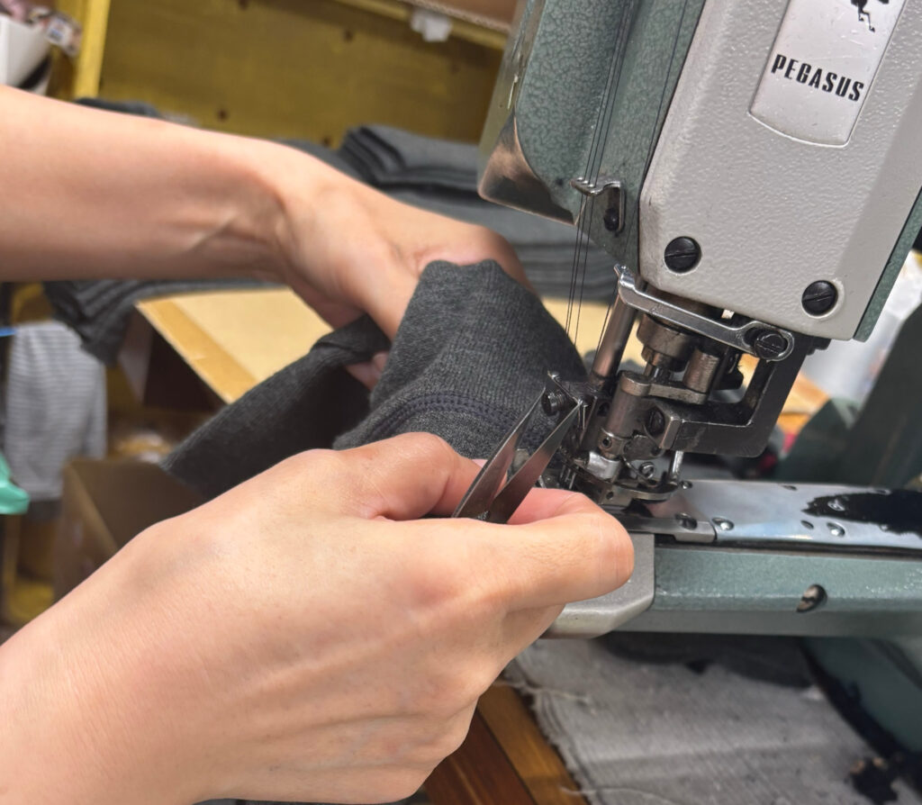 靴下製造の中心的な工程。人の目で何度もチェックを行い品質の均一化を図っています。